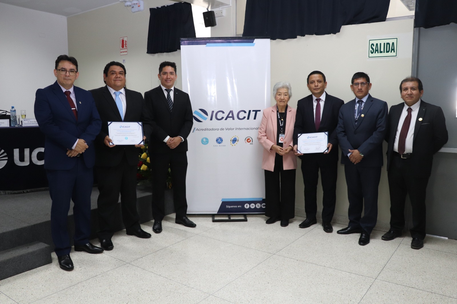 Durante la ceremonia, participaron en representación de ICACIT la Ing. Doris Maraví Gutarra, Vocal del Consejo Directivo, y Jimmy Túllume Salazar, Gerente General, quienes hicieron entrega del Certificado de Acreditación ICACIT a los programas de:
